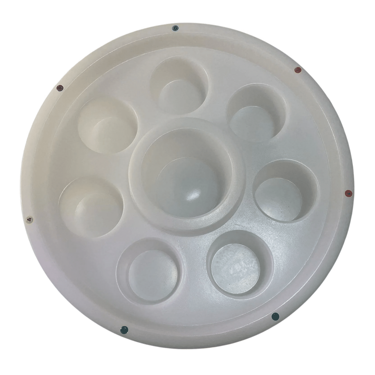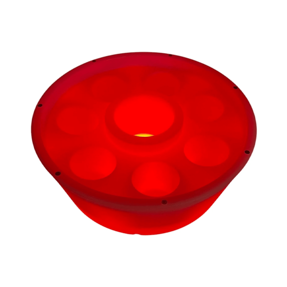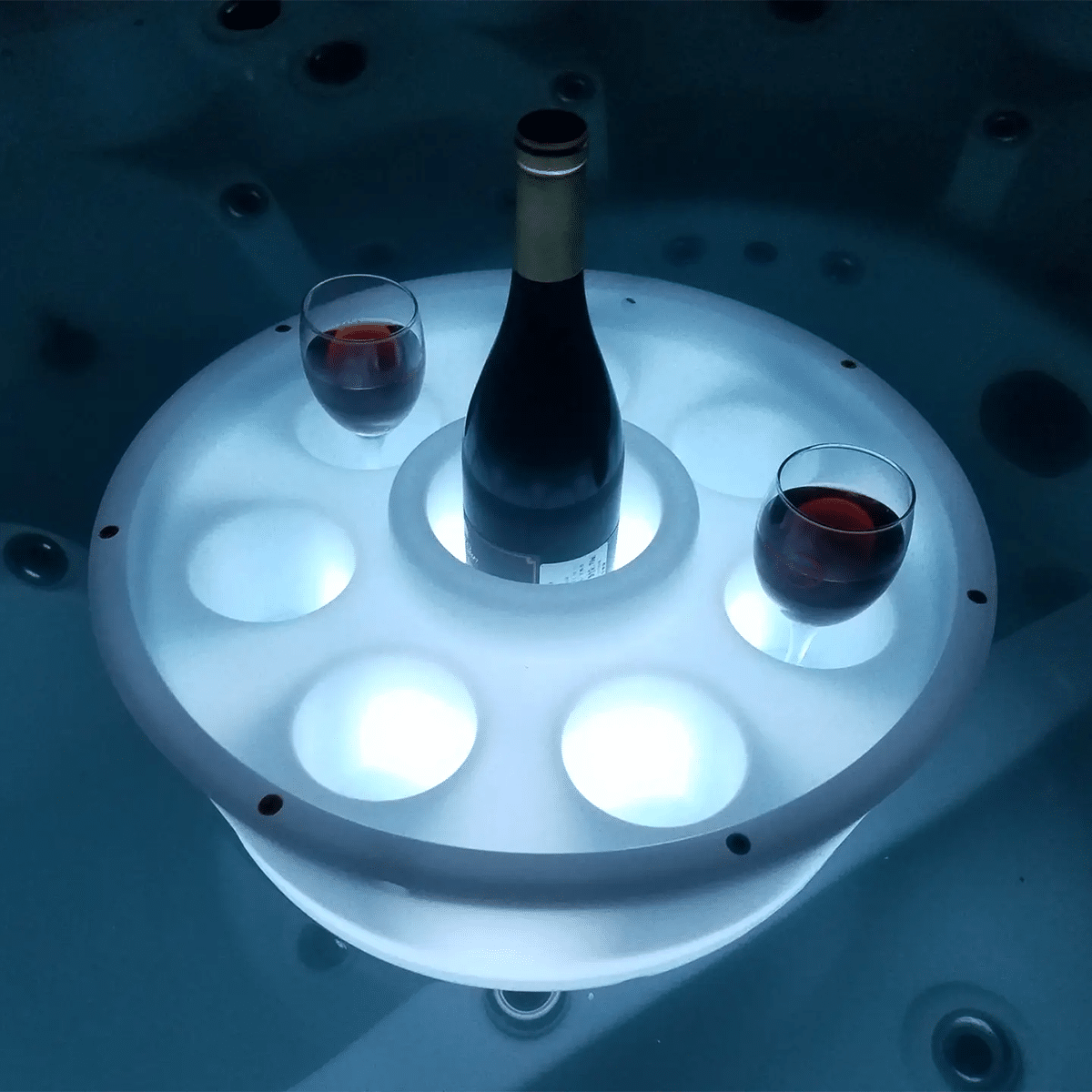 En flytande bar för poolen eller spabadet med plats för 7 glas, burkar eller flaskor och en större plats för en fullstor flaska eller snacks. Kanten på baren har 7 färgmarkeringar så att man kan hålla reda på vilket glas som tillhör vem.