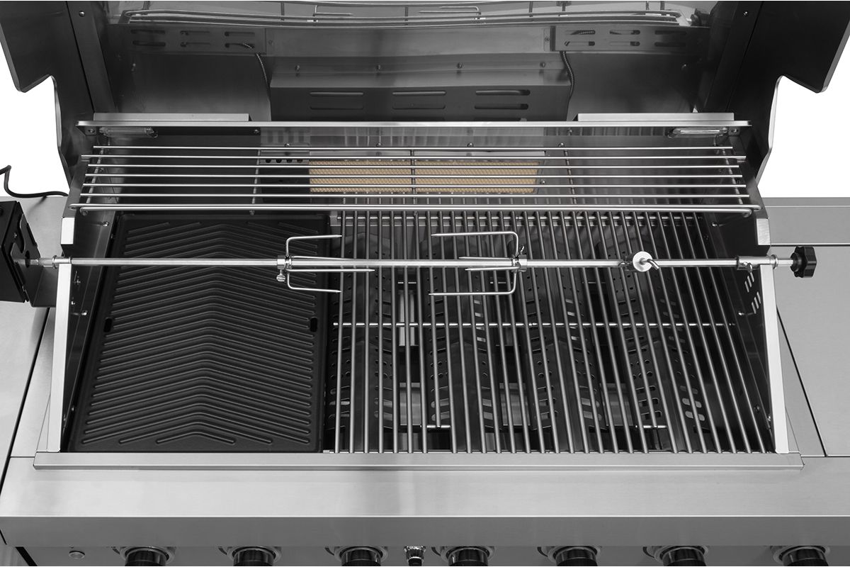 På den stora 96 x 46 cm grillytan kan du laga mat för både små och stora sällskap. Grillen har sex effektiva brännare och infraröd spettrostare medan sidoköket passar perfekt för grönsaker, potatis och såser. Med tre skåp och tre utdragbara lådor finns gott om förvaringsutrymme för grilltillbehör och det upplysta kylskåpet håller både dricka och ingredienser kalla tills de behövs. Spara tid på städningen efteråt och diska istället samtidigt som du håller ett öga på maten tack vare den inbyggda vattenkranen och diskhon. Mustang Ametist har alltså i stort sett allt man behöver i ett fungerande sommarkök.