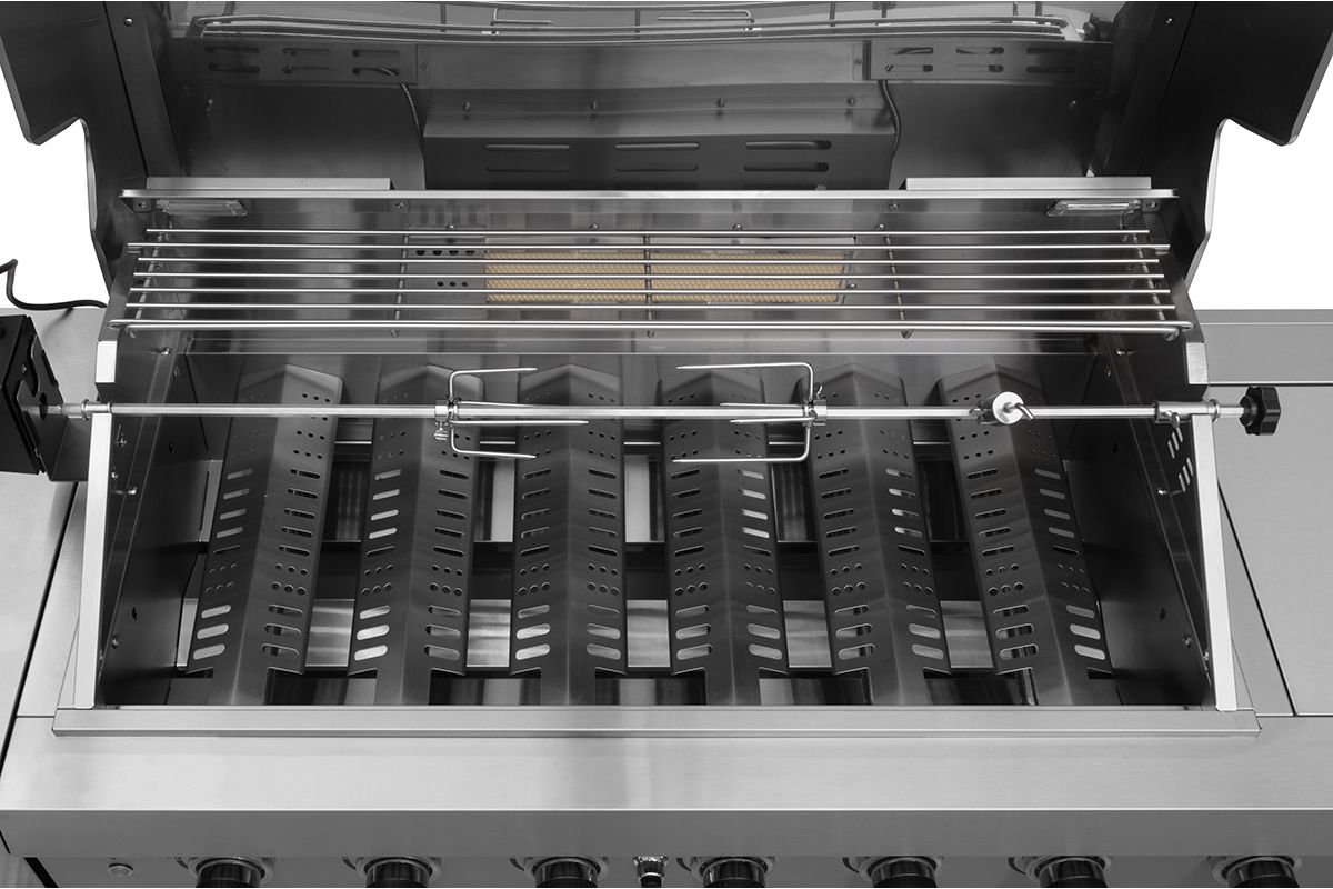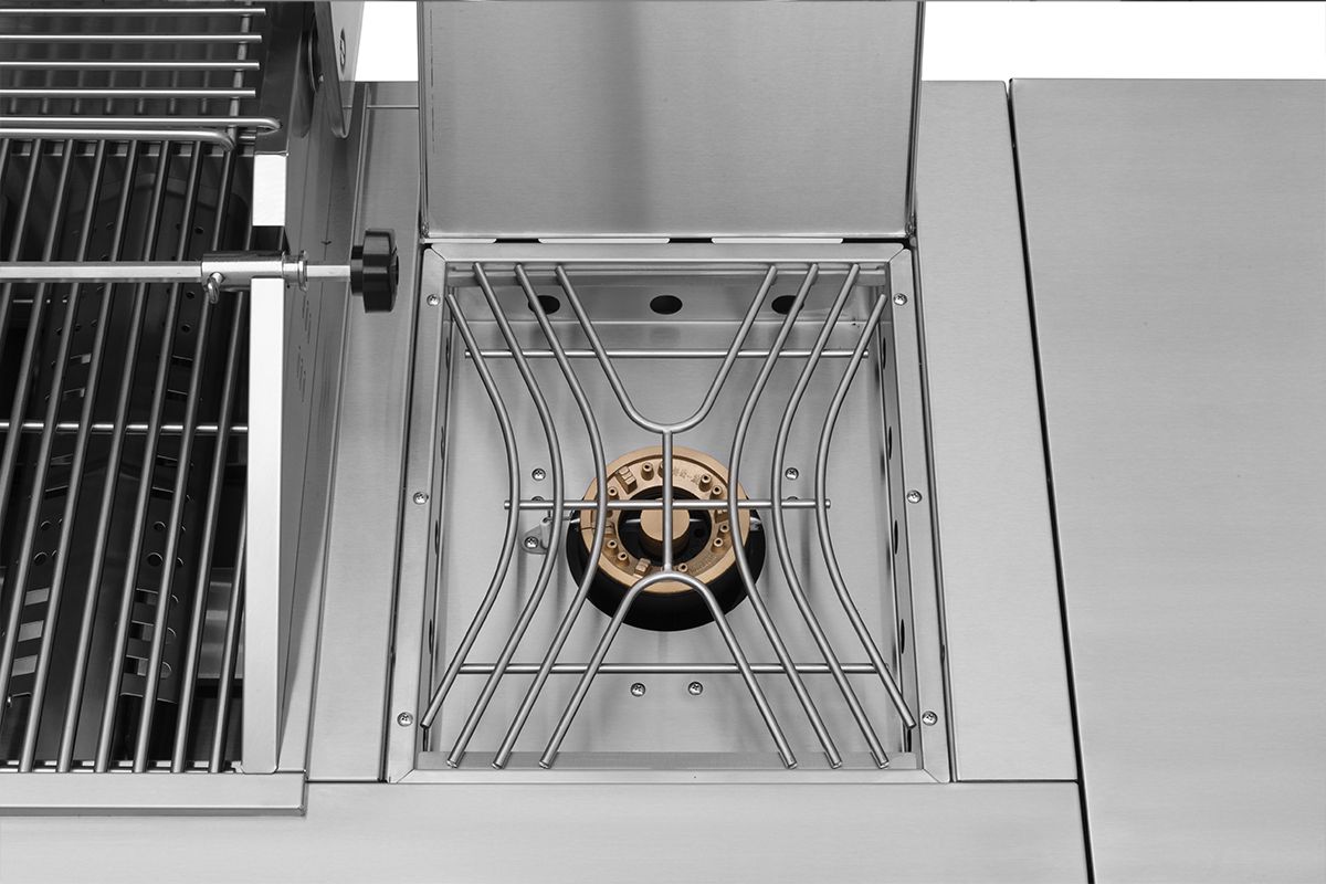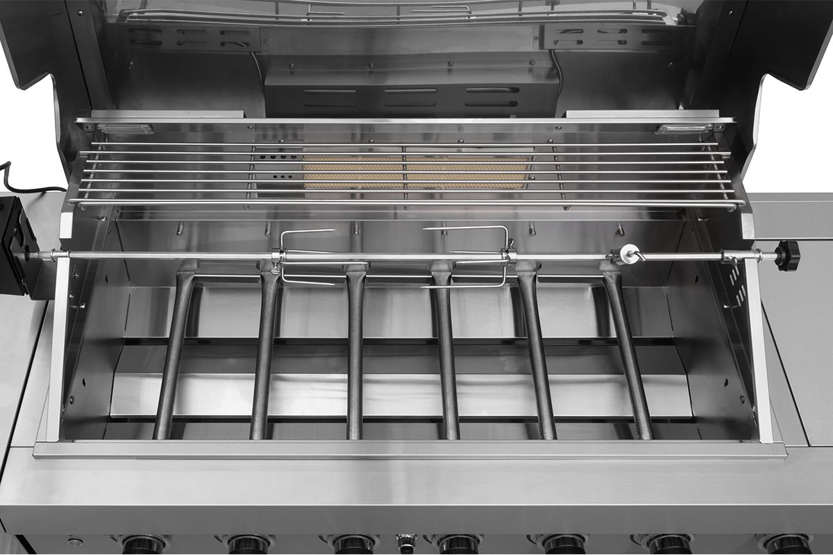 - - Rörbrännare i rostfritt stål 6 st. 3,5 kW, 1 sidobrännare 3,2 kW och infraröd spettrostare 3,5 kW. Total effekt 27,7 kW.
