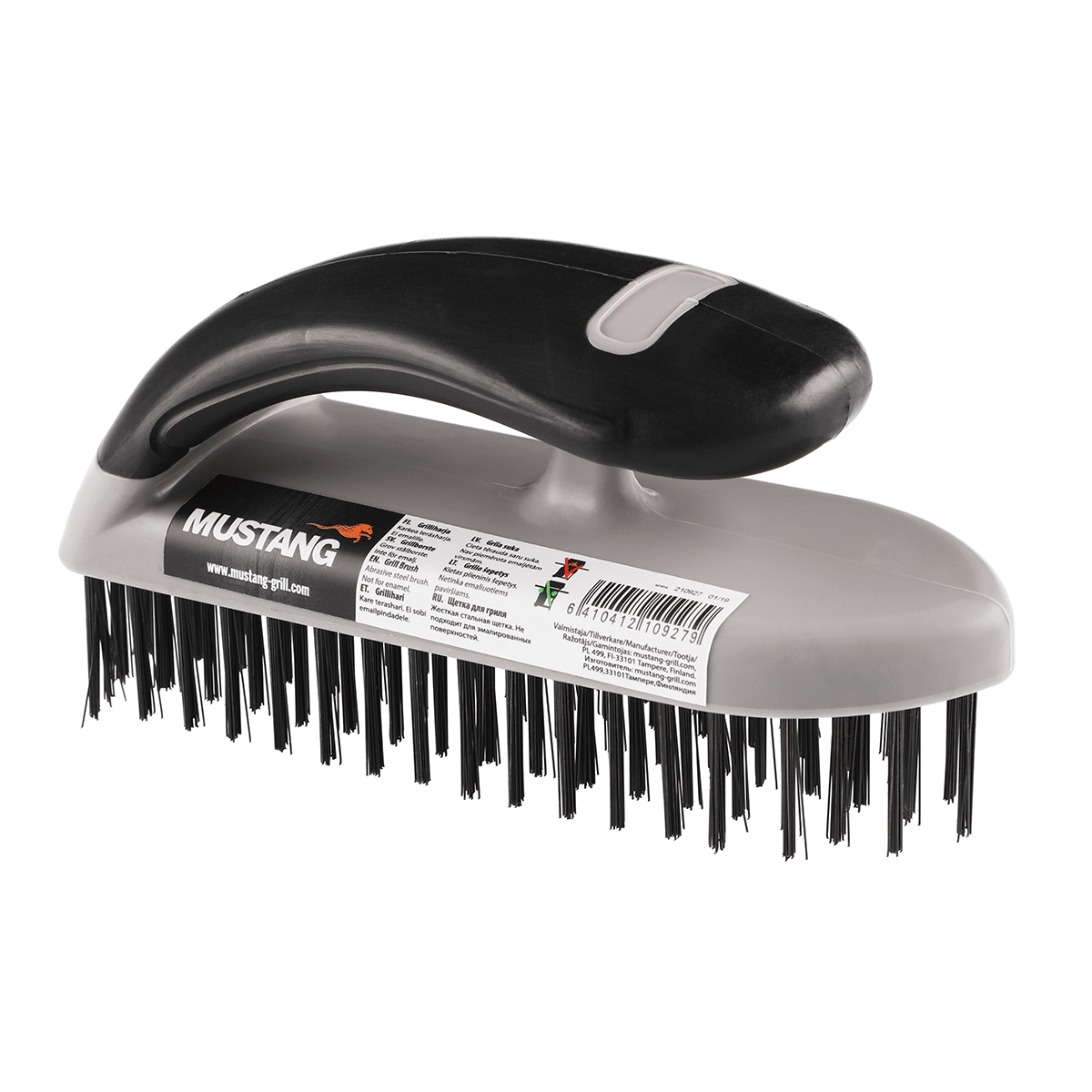 Grov stålborste för rengöring av grillgaller och grillplattor. Den svarta gummibeläggningen på handtaget gör att man får ett stadigt grepp om borsten.