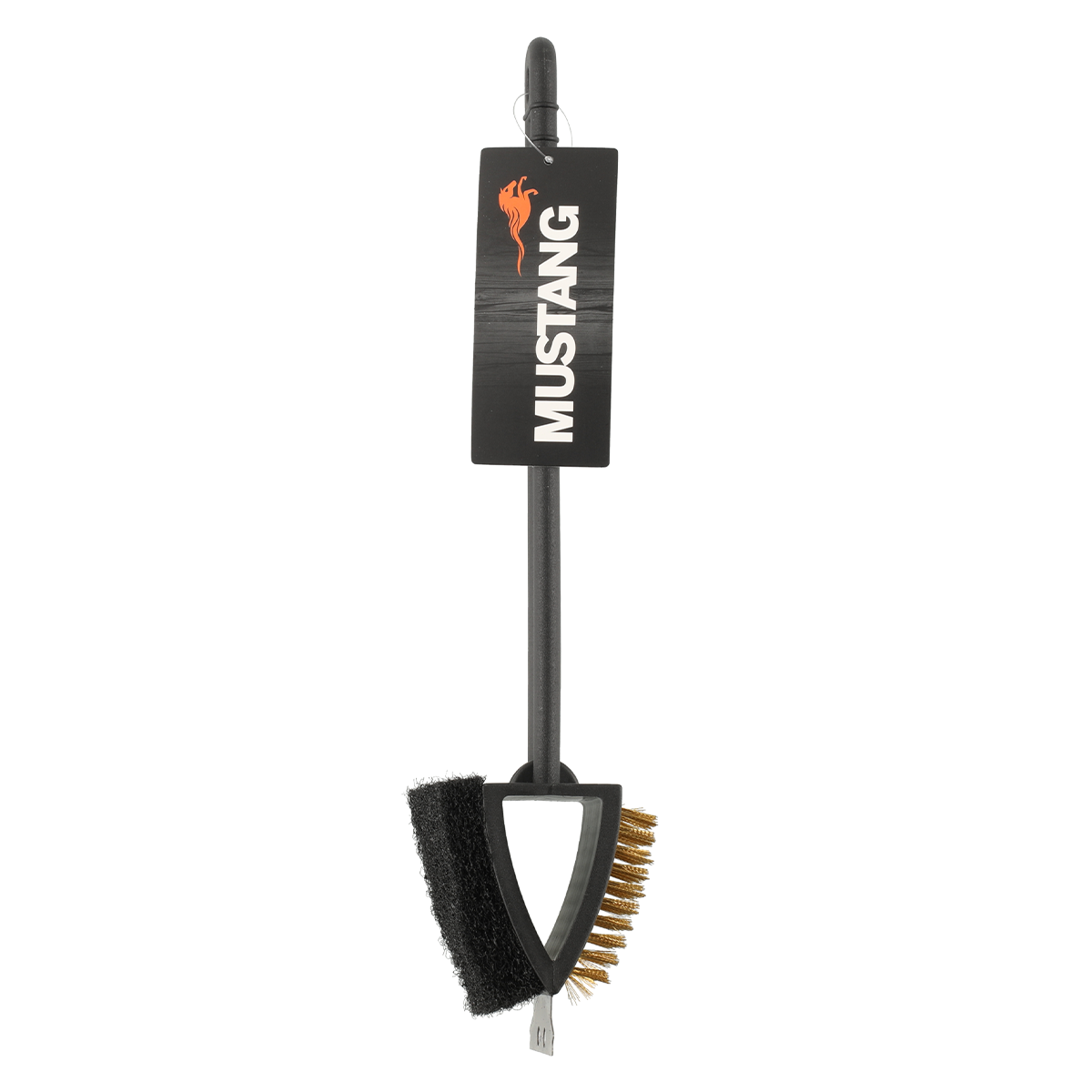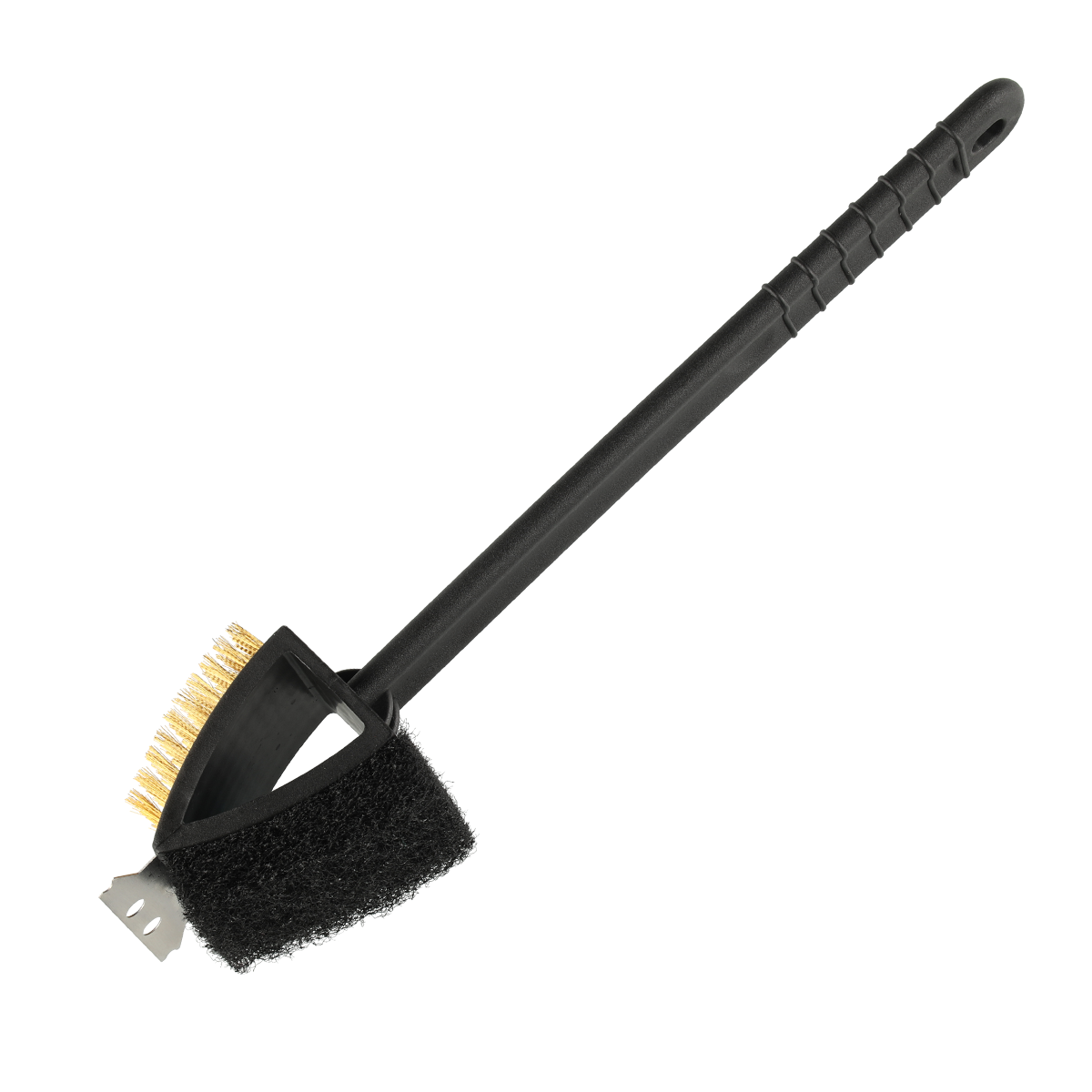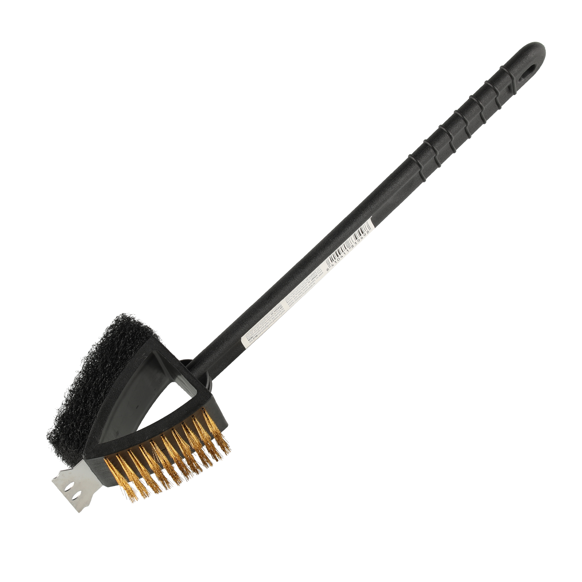 Mångsidigt användbar rengöringsborste för grill. Med en mässingborste på ena sidan, en grov svamp på den andra, och en metallskrapa längst fram.Egenskaper