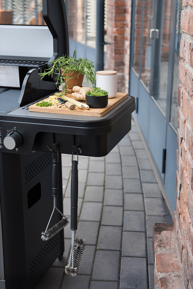 Rengöringsborste med långt handtag för grillen. Borststrån av rostfritt stål, plasthandtag, och läderögla för upphängning. Kan även användas för rengöring av brännare.Egenskaper