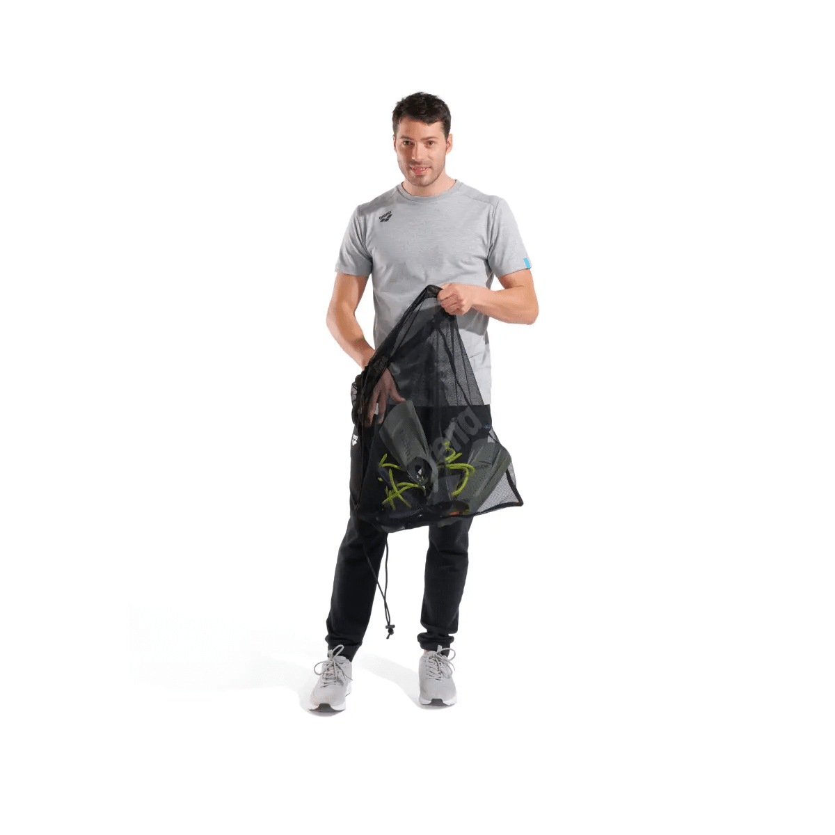 Arenas meshväska är tillverkad av ett tåligt snabbtorkande nät vilket gör den perfekt för transport och förvaring av simutrustning. Den har både ett handtag på toppen så att den kan hängas upp och en dragsko som gör att den kan bäras över axeln.