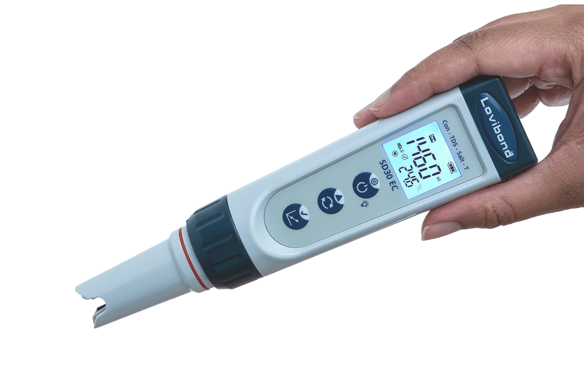 SD30 EC kan mäta Konduktivitet, TDS (Totally Disolved Substance), och Salt. Den drivs av 4 x AAA-batterier samtidigt som den har energibesparande lysdioder vilket förlänger batteriernas livslängd avsevärt, upp till 2000 timmar.Lättolkad
