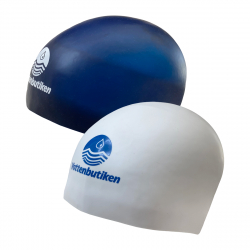 Framsidan av badmössan har ett tryck med vår logga i en kontrasterande färg.