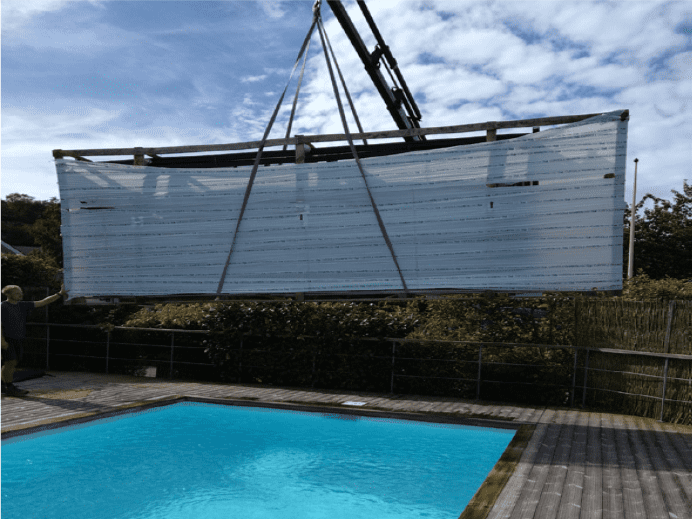 Pooltaket levereras i färdiga sektioner till er tomtgräns med en kranbil. Det enda större installationsarbetet som behöver ske på plats är att fästa skenan och låsanordningarna i poolsargen. När det är klart lyfts takets sektioner på plats i varandra enligt leveransinstruktionerna.Egenskaper