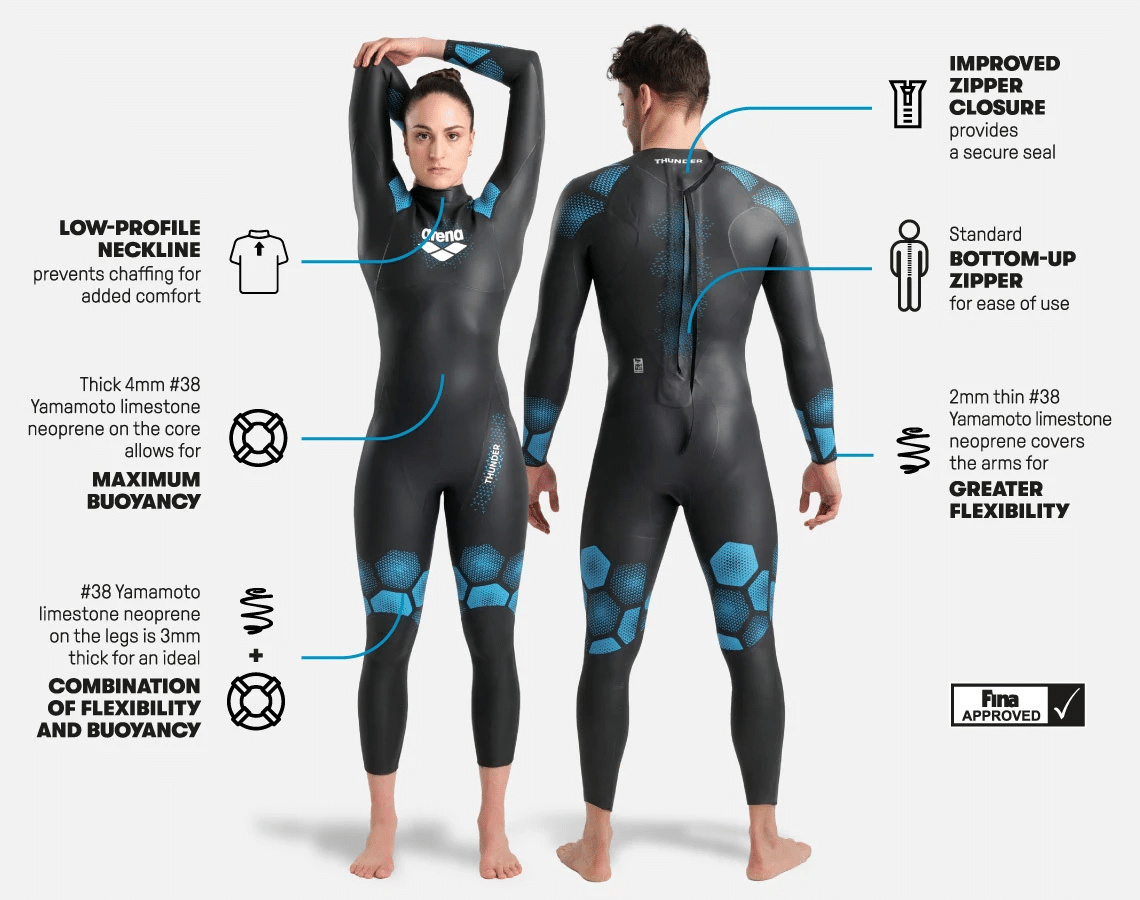 Klara ditt nästa mål! Arenas Powerskin Thunder våtdräkt för män skapades i ett försök att förstå essensen av vad nybörjare som simmar i öppet vatten behöver av en våtdräkt. Arena använde sitt bevisade arv och erfarenhet inom sporten för att ge nybörjare en tydlig lösning på deras tävlingsbehov. Powerskin Thunder-teknologin kombinerar allt det väsentliga för en högpresterande våtdräkt: optimal flexibilitet, flytkraft, isolering och komfort.